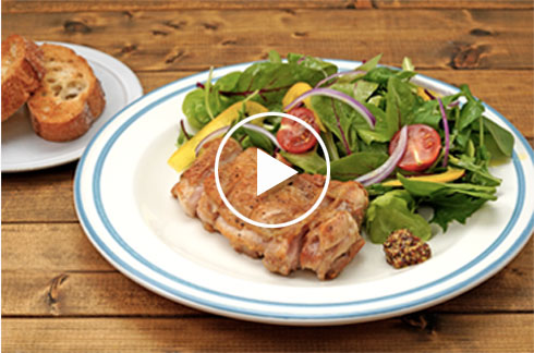 6、器にサラダの野菜を盛り付け、ドレッシングをかけ、チキンソテーをのせます。