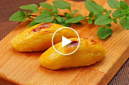 5、粗熱が取れたら、さつまいもの形に成形し、アルミカップ等に入れてつや出し用の卵と生クリームを混ぜたものを表面に塗ります。