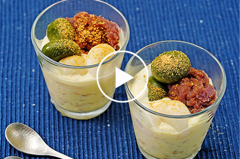 3、パフェの器にコーンフレーク、バニラアイス、粒あん、白玉を盛り付け、きな粉を振って出来上がり。