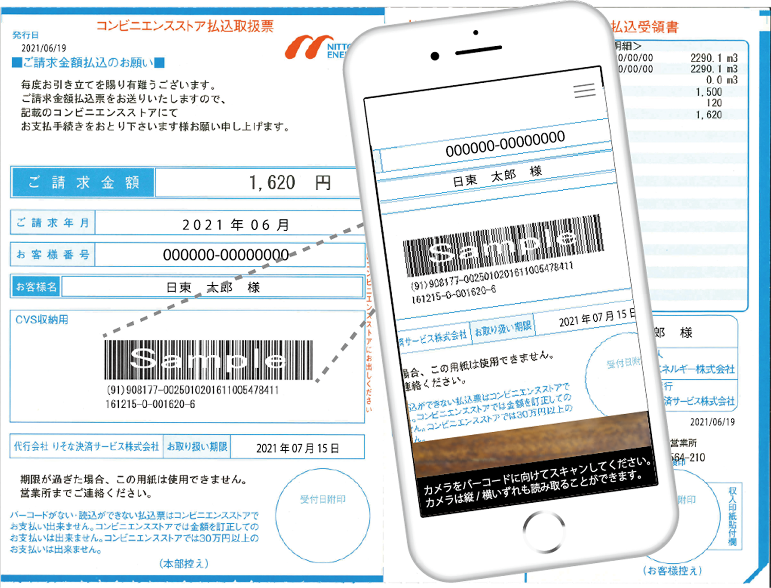 スマートフォン決済アプリでコンビニ払込票にあるバーコードを読み込むことで、