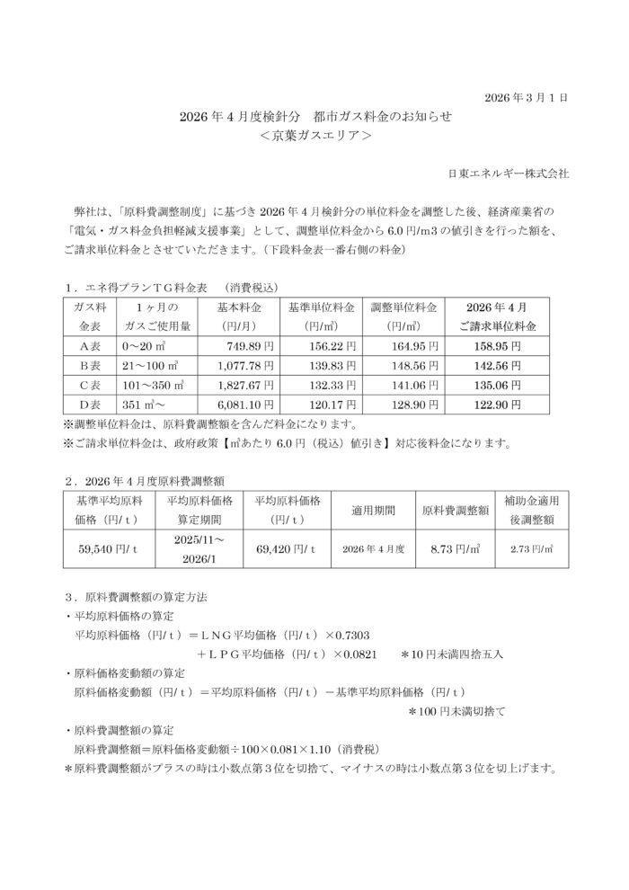 都市ガス料金のお知らせ(京葉ガスエリア)2026.3月