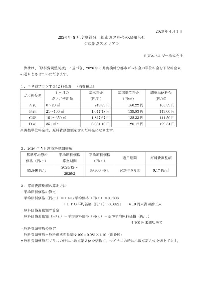 都市ガス料金のお知らせ(京葉ガスエリア)2026.5月