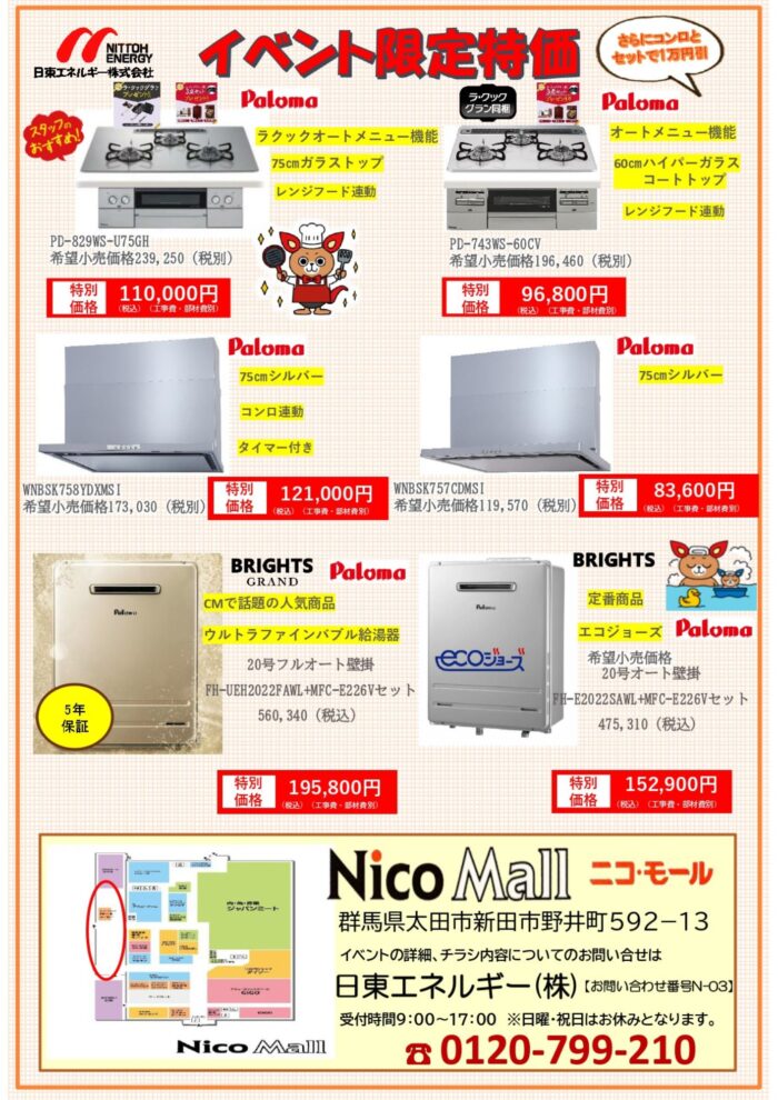 パロマのガスコンロ、レンジフード、給湯器をイベント限定価格でご案内!!!