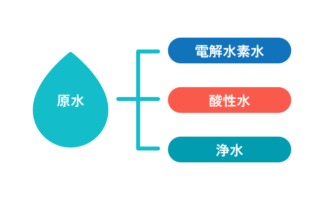 電解水素水生成器は、原水である水道水から、抗酸化性を有する水素を豊富に含むアルカリ性の水素水である電解水素水を生成するだけではなく、お肌に近い弱酸性である酸性水、19種類の除去物質に対応した浄水の3種類を生成できます。