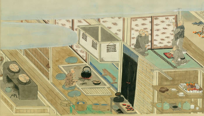 薪などを使い炊事をおこない、食の提供や準備をするだけの場所のため、この時点ではまだまだデザイン性のカケラもありません。動乱の歴史を乗り越えて、江戸時代に食は「生きる」ためのものから「楽しむ」ためのものに変化していきます。