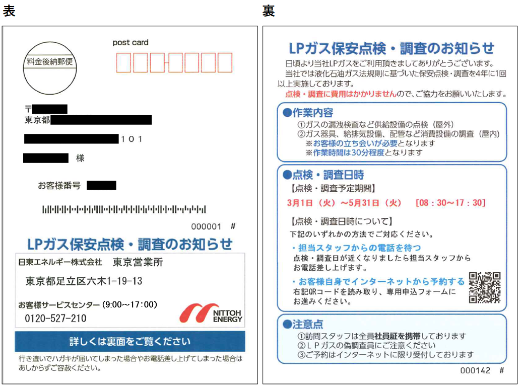 日東エネルギーから、保安点検実施について、下記の通りはがき又は電子メールにてご案内を送付させていただいております。