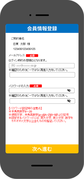 ログインID(メールアドレス)と任意のパスワード(半角英数字8桁以上の文字列)を入力してください。