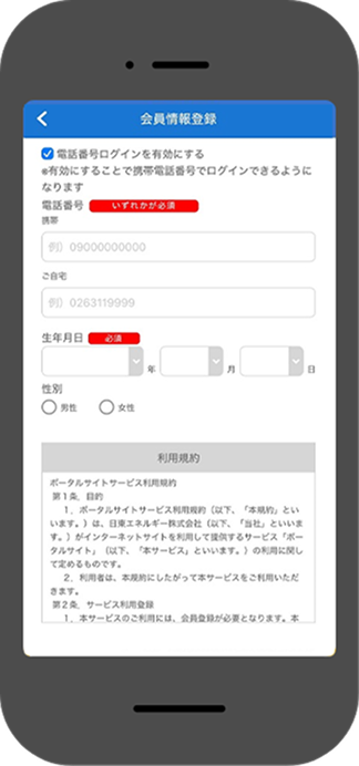 「電話番号」「生年月日」をご入力してください。「電話番号ログインを有効にする」にチェックをいれると、「携帯」の欄に入力した電話番号にてログインが可能となります。