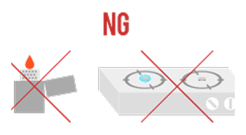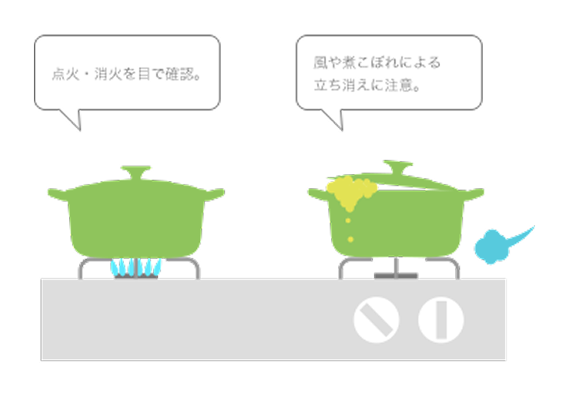 火を使っている間はその場を離れないようにしましょう。※マッチで点火する場合は、最初にマッチで火を付けてから器具栓を開くようにします。