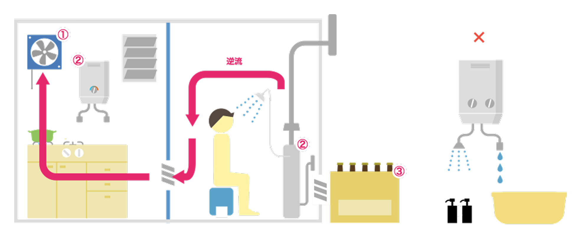・煙突式風呂釜は、シャワーを使用中や入浴中追い焚きをしている時は、絶対に台所などの換気扇は使用しないでください。排気が逆流して新鮮な空気が不足し、不完全燃焼を起こして非常に危険な状態になる場合があります。①