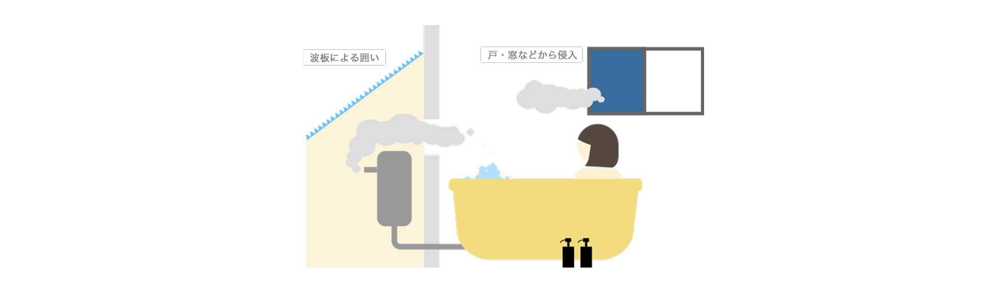 屋外設置用のガス機器を波板などで囲うと、新鮮な空気が不足し、不完全燃焼による事故やガス機器の故障の原因となります。 増改築による屋内化や波板等で囲う場合には、給排気設備が必要になります。