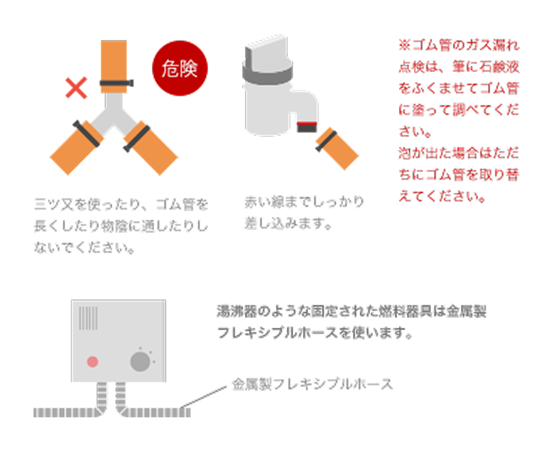 ゴム管はときどき点検し、早めに取り替えます