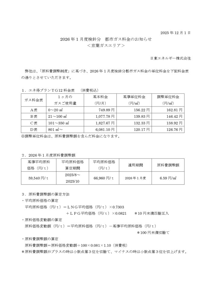 都市ガス料金のお知らせ(東京ガスエリア)2025.12月