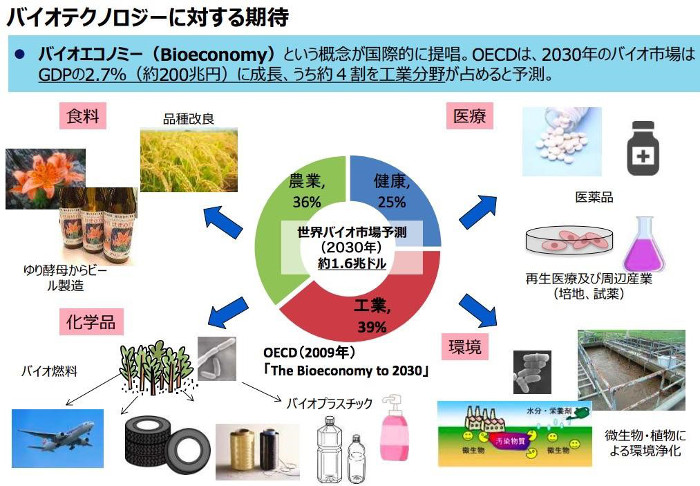 OECD(経済協力開発機構)はその加盟国における2030年のバイオ産業市場が全GDPの2.7%(約200兆円)にのぼると推定しています。